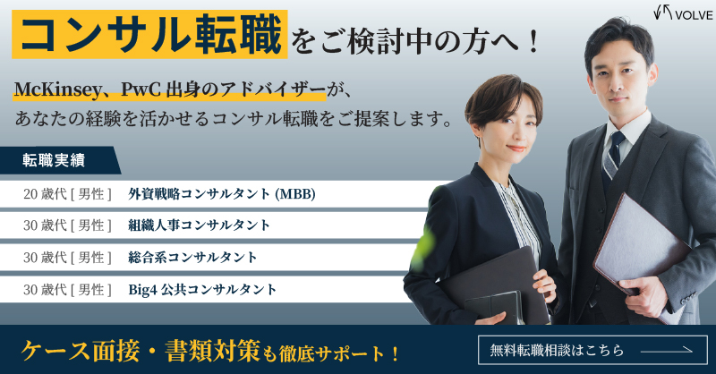 公務員として培った調整力・分析力・公共性は、コンサルティングの現場で高く評価される資質です。VOLVEでは、公務員出身者の方々の業務経験を言語化し、 戦略系・総合系・シンクタンク系など多様なファームへの転職を支援しています。官から民へ。経験を社会を動かす力に変える。
